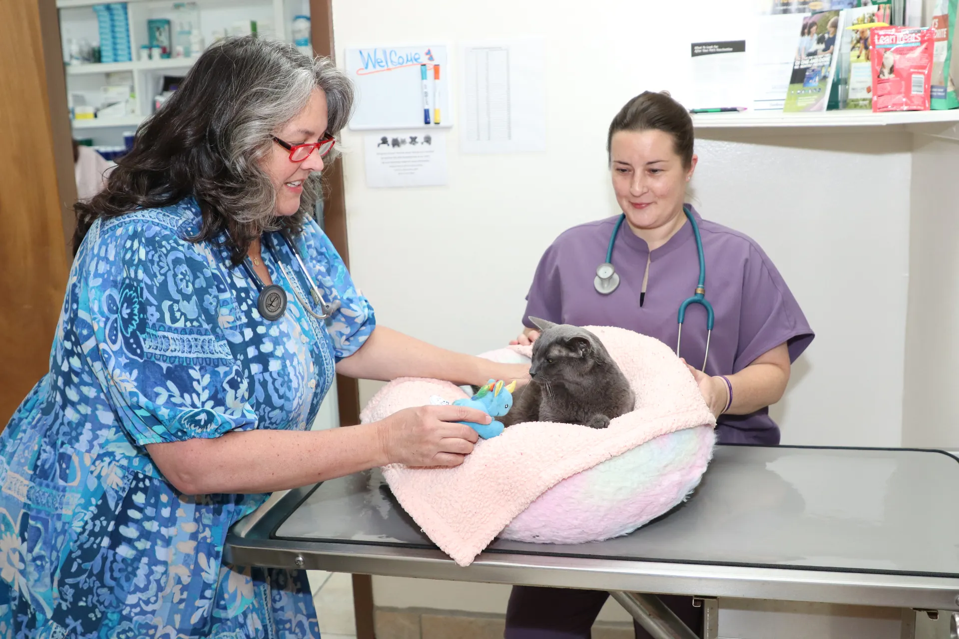 Your visit with us begins with you being greeted by our client care team. All of our team members are Fear Free™ Certified. Your cat or dog companion will be greeted with gentle handling, calming techniques, and plenty of kindness to help them immediately feel safe and at ease.